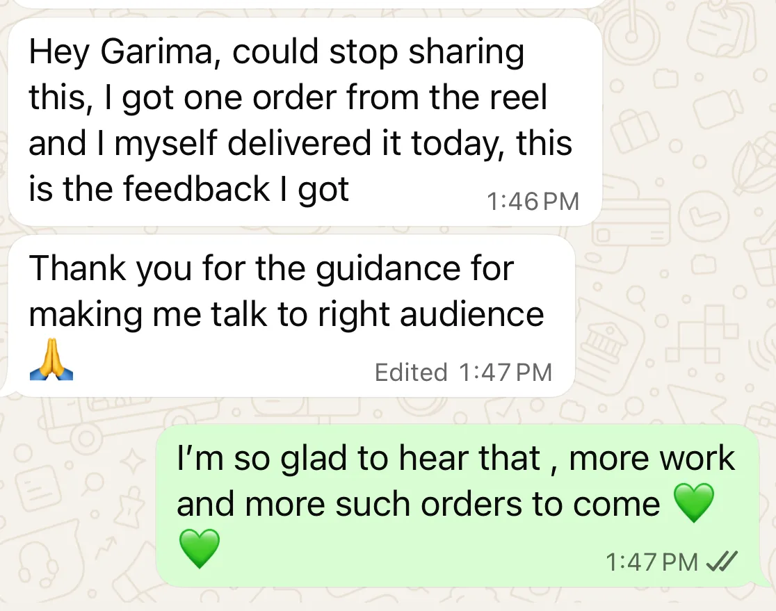 Garima’s course showed me exactly how to fix my messaging and simplify my marketing. For the first time, I could explain my brand in a way that clicked with customers. The best part? We started seeing more inquiries and actual buyers, not just likes and follows.